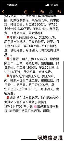 以上岗位月休四天,食宿免费。地址:哈尔滨市平房区。加我微信给你发具体位置和坐车路线。微信电话同号