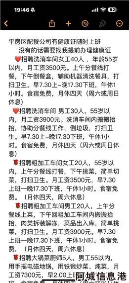 2、招聘洗消车间 *工30人,55岁以内,月工资3900元。洗消车间内搬搬抬抬,协助分餐线工作,倒垃圾,打扫卫生。早7.30上-晚17.30下班,午休1小时。