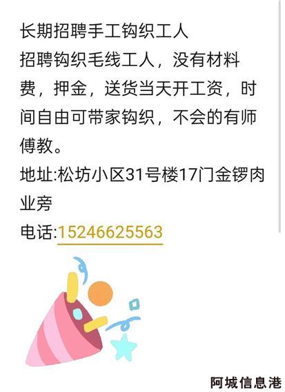 面向社会大量招钩织女工,有无钩针基础都可以,免费教学,时间自由,学会后在家就可以做,适合宝妈、宝奶,上班族、闲来无事打发时间的都可以做。